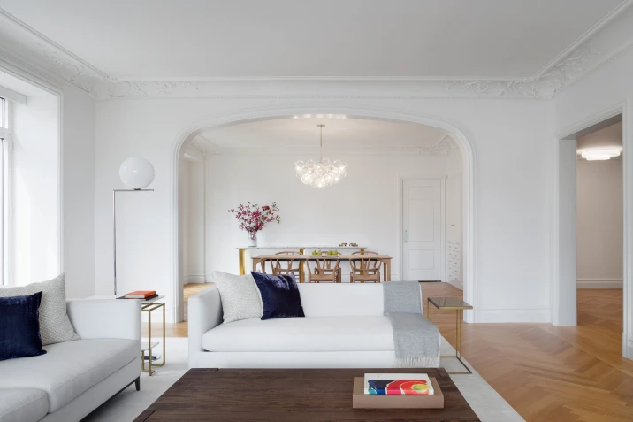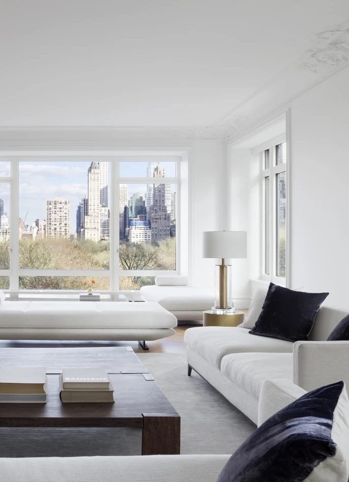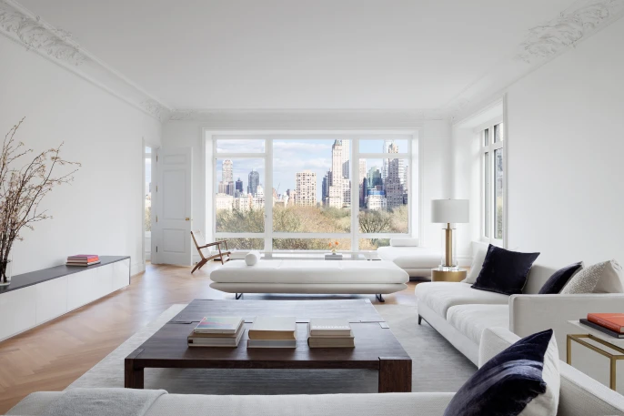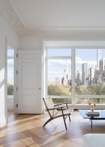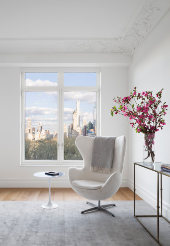 Located in a building overlooking Central Park, the design for this apartment takes inspiration from the iconic pre-war buildings located along Central Park, as well as from the park itself. A new arched opening was introduced between the living and dining rooms, connecting the two spaces and creating an extended grand room with views of the park and cityscape beyond.