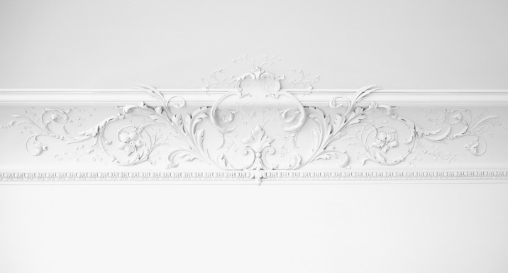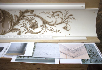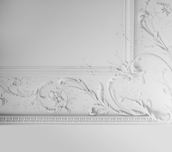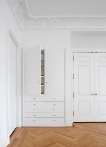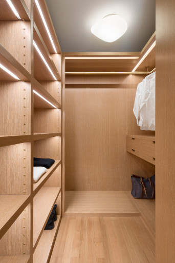 Bolection-shaped plaster casings frame all of the openings, doors, and windows. The foliated rinceaux-patterned crown moldings were influenced by the flora of Central Park and create a sense of biophilia throughout the space. In the primary bedroom, cerused white oak, a centuries-old technique to enhance and lighten wood, was used to fit out the primary closets with bespoke millwork.