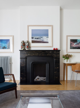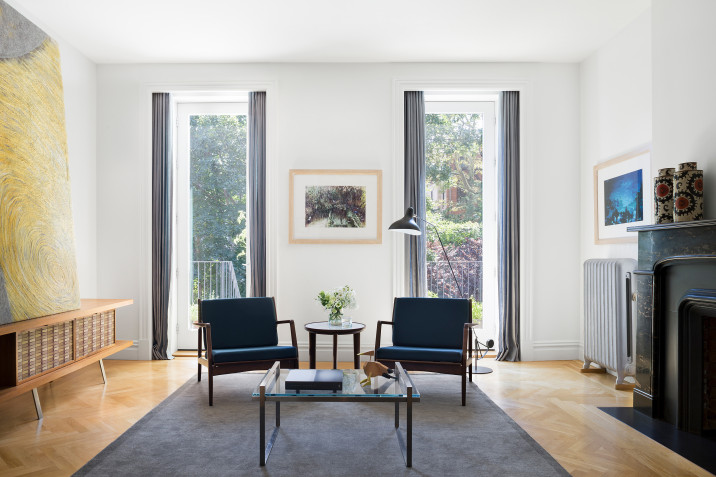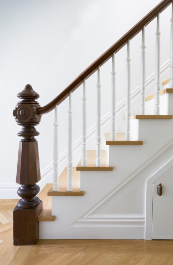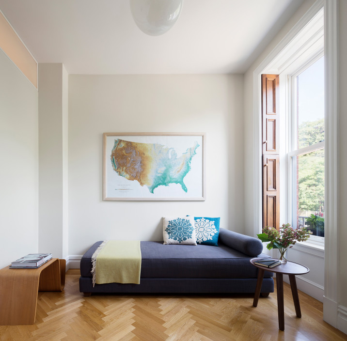 Through a careful research initiative, the architectural team developed a strategy to selectively integrate the home’s design history into the newly updated residence. These nods to the home’s past were sensitively combined with materials sourced from Brooklyn salvage yards, such as the black and gold fireplace mantel, stair balusters and window shutters. YUN’s scope included both aesthetic and invisible improvements, including structurally reinforcing the floors, super insulating the house, and upgrading the mechanicals. New finishes were added such as white oak herringbone-pattern flooring and new cabinetry throughout.