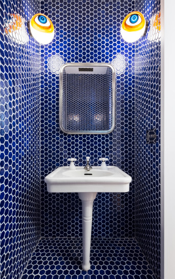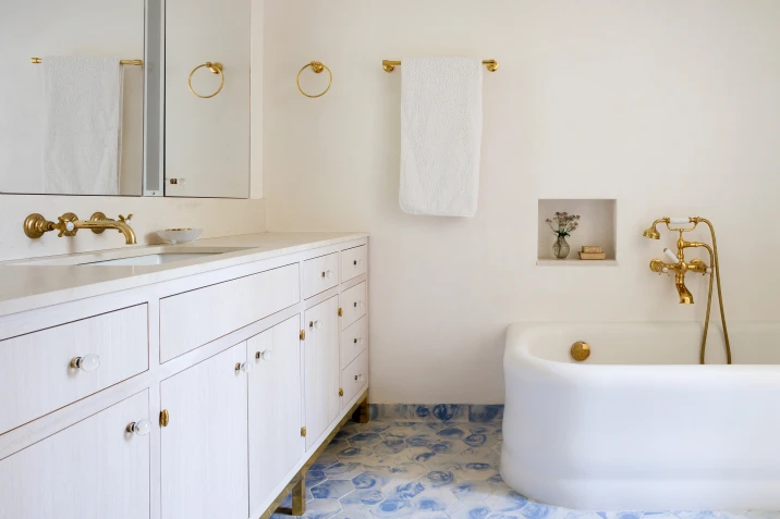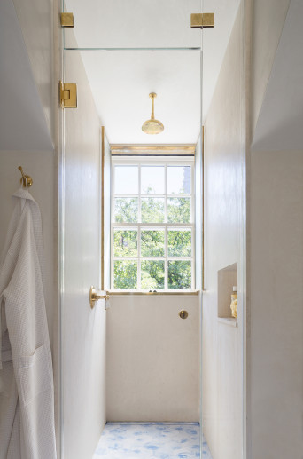 Throughout the interior, floors were refinished with wide, salvaged pine floor boards, custom-designed millwork, and moldings and trim were added throughout. The 4 fireplaces were reactivated and clad with limestone mantles or custom tilework designed by the owner. The cellar was transformed into an art studio and exhibition space for the owners, both accomplished artists.